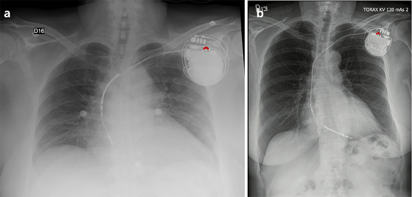 El electrocardiograma inicial mostró un ritmo de marcapasos en modo DDD con adecuada estimulación auricular, fallo del sensado ventricular y pseudofusiones frecuentes. Se realizó un ecocardiograma transtorácico en el que se observó el ventrículo derecho sin electrodo en su interior. En la radiografía de tórax se evidenció desplazamiento de electrodos; el electrodo auricular se encontraba en la aurícula derecha bajo tracción y el electrodo ventricular estaba en la vena cava superior (Figura 1a). Además, se observaron los electrodos enrollados alrededor de la carcasa. Interesantemente, se evidenció una rotación de 180 grados del dispositivo en su eje sagital; después, la rotación se confirmó al comparar la ubicación del conector con la radiografía tomada en el postoperatorio inmediato del implante (Figura 1b). Por lo tanto, se sospechó que el desalojo de los electrodos correspondía a un mecanismo mixto, incluyendo el síndrome de ratchet y reel. Se revisó el dispositivo, encontrándose batería normal y disfunción por defectos de sensado y captura de los electrodos auricular y ventricular. No se registraron arritmias ni descargas como alertas vibratorias activas, por lo que los síntomas no estaban relacionados con la descarga del dispositivo.