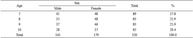 The sample consisted of 320 children from four public schools in a city in the South of Minas Gerais, 55.94% of whom were girls. Two schools were located in the central region of the city and the remaining two on the outskirts. Ages ranged between seven and 10 years (M = 8.39; SD = 1.10) with a homogeneous distribution, as can be observed in Table 1.