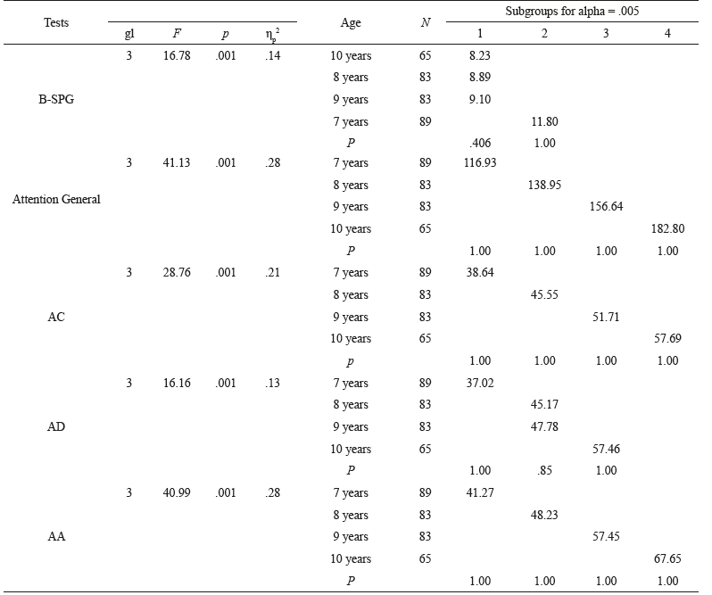 All differences were significant. The analysis of which groups were involved in the differences showed that, in the B-SPG, two mutually distinct sets are constituted, with seven-year-olds obtaining a significantly higher mean score than the other children. Concerning the BPA, four groups were constituted with significantly distinct means on the CA, AA and General Attention. In these cases, all ages differed, the lowest means relating to seven-year-olds and the highest to ten-year-old children. Only three groups were found for the DA test, the first consisting of seven-year-olds, the second of eight and nine-year-olds and the third of ten-year-old children.