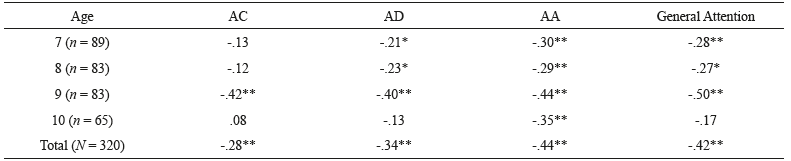 For the total sample, the B-SPG correlation coefficients were statistically significant but weak when related to the CA and DA and moderate when associated with the AA and General Attention, in view of the classification by Dancey and Reidy (2013). The highest coefficients were found for nine-year-olds. These were all statistically significant, positive and moderate. When considering seven and eight-year-olds, the correlations were weak for all BPA scores, being significant for DA, AA and General Attention. At the age of ten years, all coefficients were weak and the results were significant only for the AA test. It is also relevant to highlight that all AA coefficients were statistically significant and ranged between weak and moderate.