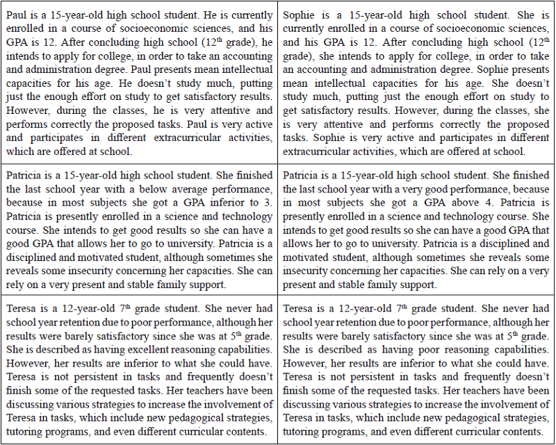 Each excerptinvolveda target variable that could be included in one of three distinct categories of information about the student: (1) socio-demographic, namely gender, SES, social environment, family support; (2) personal features, such as intellectual ability, self-control capacity, discipline, and social skills; (3) previous academic achievement.In each excerpt, only one of these characteristics was targeted, aswe intended each variable to be assessed separately by participants in each description provided.