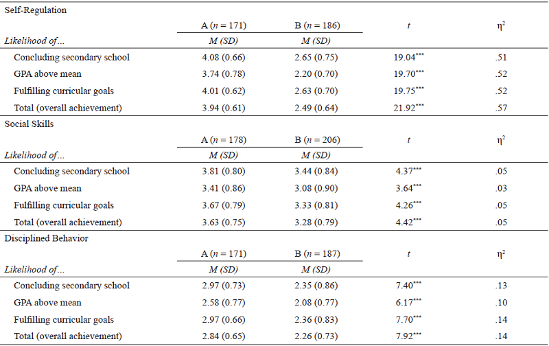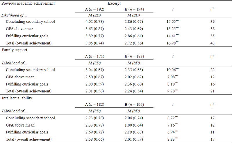 The overall pattern of results shows moderate to high differences in teacher estimates according to the nature of the information that was presented. Concerning previous academic achievement, family support, intellectual ability, self-regulation capacity, social skills, and disciplined behavior, teachers to whom more favorable information on that variable was presented (i.e. those that received version A excerpts) report significantly higher expectations of potential academic success than teachers to whom less favorable information was presented (i.e., those that received version B excerpts). That is to say, when presented with favorable information regarding these characteristics - the student previously had good marks in this school pathway, or shows efficient study habits, or expresses signs of high intellectual ability, or behaves well at school - participants make higher estimates of academic success, when compared to the participants who were presented with neutral or less favorable information about the hypothetical student (Table 1).