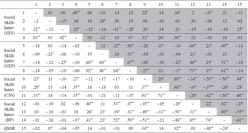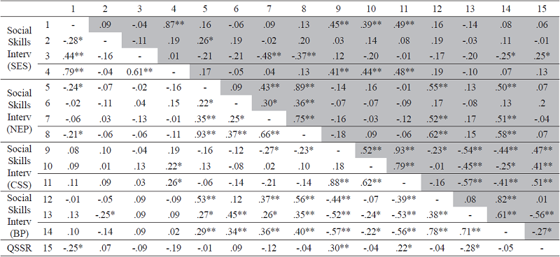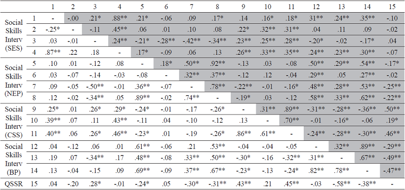 The results of correlations of preschoolers according to gender presented in Table 1 reveal, for both girls and boys: (1) negative correlations between behavior problems and children’s social skills; (2) positive correlations between children’s social and educational skills; and (3) positive correlations between negative educational practices and behavior problems. Table 2 presents the correlations among the instruments’ categories according to clinical condition.