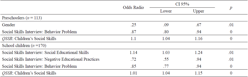 The results concerning the Binary Logistic Regression for preschool and school children reveal that the independent variables of gender, behavior problems and children’s social skills among preschoolers presented significant predictive values for the dependent variable concerning indicators of behavior problems. Social educational skills and negative educational practices, behavior problems and social skills presented significant predictive value for the group of school children. Hence, the behaviors of school children may vary according to differences in educational practices.