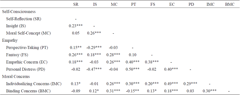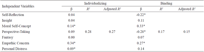 As observed in Table 1, the score of individualizing moral concerns (IMC) was positively correlated to self-reflection (SR), moral self-concept (MC), perspective-taking (PT), empathic concern (EC), personal distress (PD), fantasy (FS), and binding moral concerns (BMC). Binding moral concerns (BMC) showed a positive correlation with insight (IS), moral self-concept (MC), fantasy (FS), and empathic concern (EC) and a negative correlation with perspective-taking (PT).