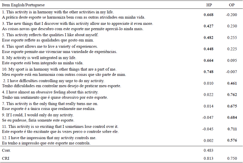 Results presented in Table 1 show that the items presented factorial loads according to the theoretical perspective described by the dualistic model of passion. Thus, items that composed the HP factor (items: 2, 4, 7, 9, 11 and 17) presented factorial loads in the respective factor, ranging from 0.461 (item 2) to 0.762 (item 4). Also, in relation to the OP factor, these same items had low or negative factor loads, varying between 0.002 (item 12) and -0.045 (item 11). On the other hand, the items theoretically destined to the assessment of the OP factor presented factorial loads, in the respective factor, that varied between 0.427 (item 3) and 0.748 (item 10), presenting similar values to the aforementioned results, low or negative loads in the other factor (ranging from -0.007 in item 10 and 0.255 in item 5). As to the correlation between factors, a moderate correlation index was obtained (r=0.483). These results support the first validity evidence based on the internal structure of the Brazilian version of PS. Still in this analysis, the composite reliability indexes presented by each of the factors were adequate: 0.813 for the HP factor and 0.750 for the OP factor, results that support the reliability of the Brazilian version.