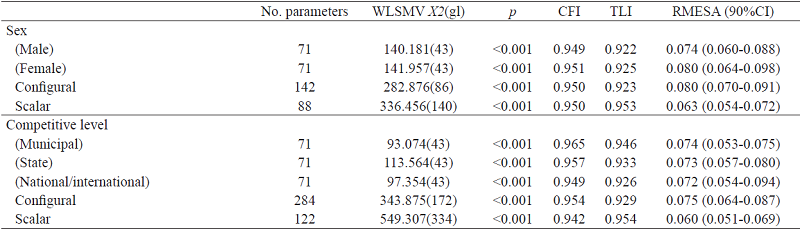 Notably the results obtained in the ESEM-Multigroups can be classified as good, suggesting the equivalence of the measurement model for evaluating groups formed by men and women, as well as among the groups formed by participants of different competitive levels (municipal, state, national/international).