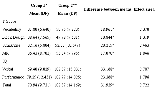 Results of between group comparison. Table 1 shows the mean scores on intelligence test for both groups as well as the difference between them and its size effects. The covariance analysis showed no significant difference in years of schooling (F(1, 276) = 0.001 to 0.81, p = 0.36 to 0.99), indicating no significant effects of this variable when the means scores in intelligence were compared. There were statistically significant differences between Groups 1 and 2 in all subtests and composite WASI scores. It was also possible to observe that the effect size was very large in all comparisons (Rosenthal, 1996).
