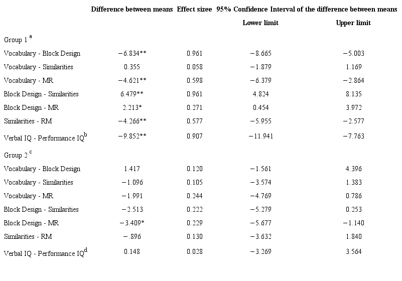 Results of within-group comparison. Table 2 shows the results of within-group analyses, showing the differences between the means of the WASI subtests within each group, the effect size of the differences, and the lower and upper limits of the confidence interval. It was possible to find a different performance pattern for children from outskirt regions (Group 1) and for children from central regions (Group 2). Children living in the outskirt area of Porto Alegre differed internally in their scores, while children from more central regions showed little variation in their performance.