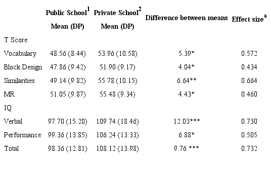 The groups differed significantly in all measures. Public School children had lower scores than those from Private School. In the comparison, no difference presented a large effect size. The comparison between the Vocabulary and Similarities subtests and the Verbal, Performance, and Total IQ subscales showed a medium effect size. The differences between the means of the Block Design and Matrix Reasoning subtests obtained a small effect size.