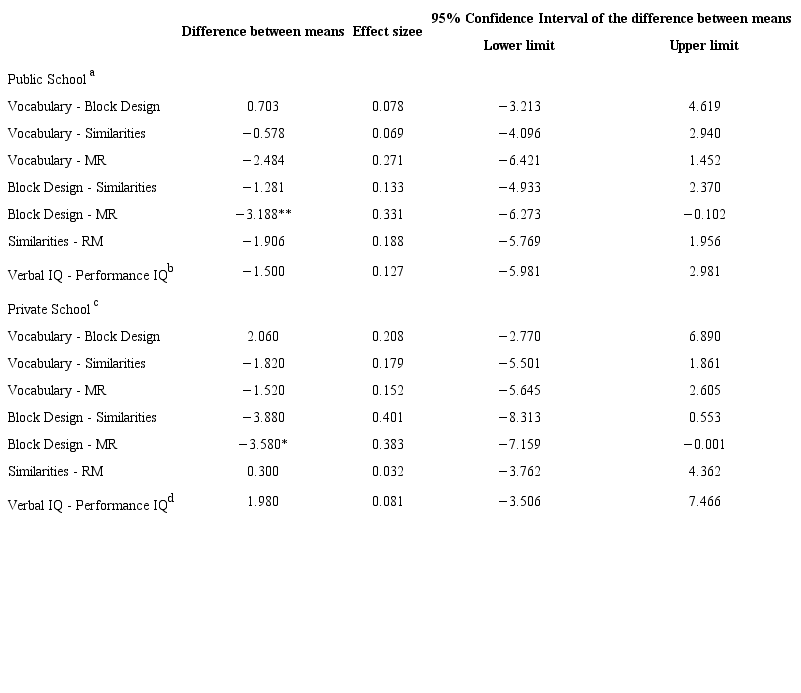 Results of within-group comparison. Table 4 shows the differences between the subtest means within each group. From this, it was possible to observe that the groups did not differ regarding the internal performance standard, both presenting uniform results on the scale. The vast majority of subtest pairs did not obtain a significant difference in means for the two groups, except for the Block Design and Matrix Reasoning pair, which differed both for public and private school children, but with a small effect size.