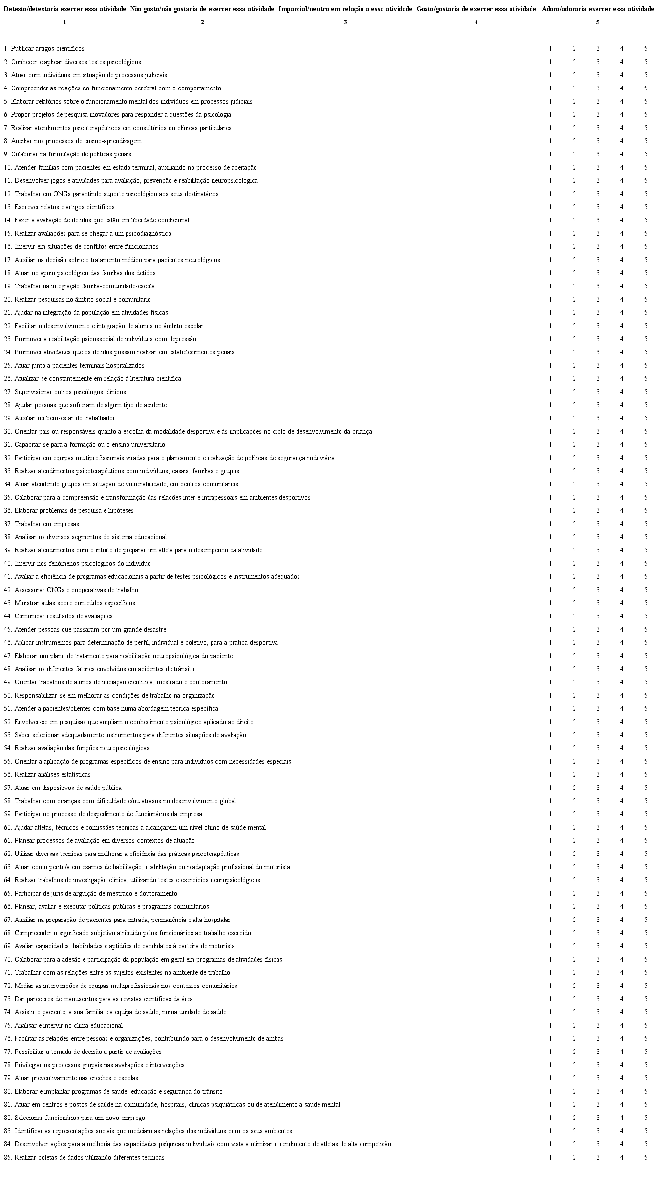 A seguir, encontrará listadas atividades que os psicólogos podem exercer profissionalmente. Por favor, leia atentamente cada uma e marque o número que corresponde ao seu grau de interesse por essa mesma atividade (quanto gosta ou gostaria de exercer cada atividade), de acordo com a seguinte escala: