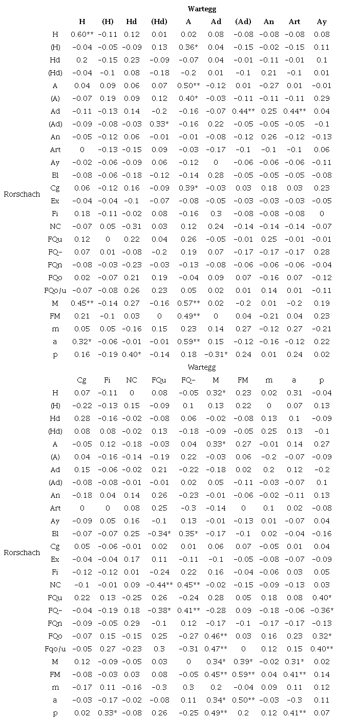 In Table 1 it is possible to observe a correlation of strong magnitude (0.60), 21 correlations ranging from 0.40 to 0.59 and 17 from 0.31 to 0.39. The greatest correlation found was verified between the H contents of the two techniques, signaling similarity in their variance. It is also possible to observe correlations between the content codes of both techniques comprising (Hd), A, Ad, (Ad) and Art from Wartegg and (H), A, Ad, (Ad), Cg from the Rorschach test varying between 0.33 and 0.50.