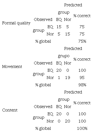 For movement, there are 20 true positives and 19 true negatives, predicting 98% of the cases (R2 Cox & Snell = 0.725 and R2 Nagelkerke = 0.967), Finally, for content it is possible to observe that all true positives and negatives were found, predicting 100% of the cases (R2 Cox & Snell = 0.750 and R2 Nagelkerke = 1).