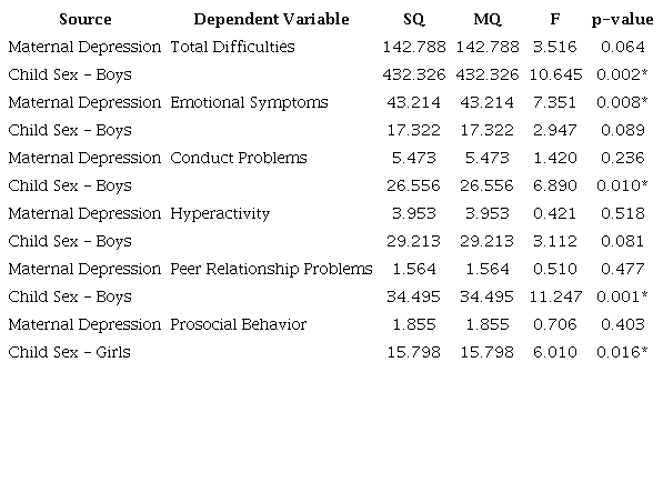 Table 1 shows model 1 of covariance analyses (ANCOVA), in which the effects of maternal depression (main factor) for behavior (outcome) measured by the SDQ were tested, controlling the effects of children’s sex (covariate).