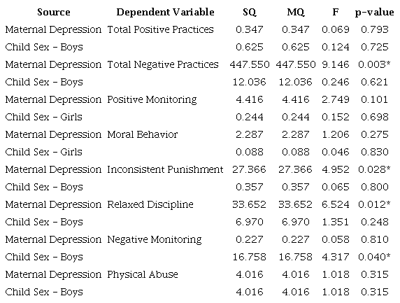 Table 2 shows model 2 of covariance analyses (ANCOVA), with the effect of maternal depression (main factor) for maternal parental practices (total outcome and scales), controlling the sex of the children (covariate factor).