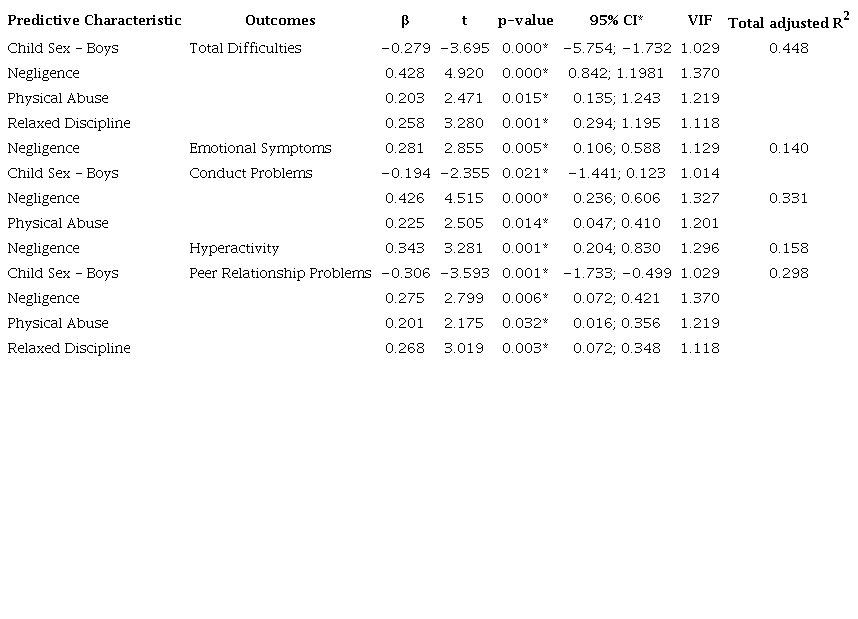 For the total behavioral difficulties, the child’s sex (male), neglect, physical abuse, and relaxed discipline were predictors of more problems, being responsible for about 45% of the score variation. Regarding emotional symptoms and hyperactivity, neglect was the only predictor, accounting for 14% and 16% of the score variation, respectively. Regarding conduct problems, the predictor variables were male gender, neglect, and physical abuse, causing about 33% of variance. And for peer relationship problems, the predictor variables were male gender, neglect, physical abuse, and relaxed discipline, causing about 30% of variance. Contrary to expectations, maternal depression was not identified as a predictor for any of the outcomes.