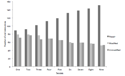 When the metalinguistic feedback strategy was used with Group 1, the number of error repairs steadily increased during the nine sessions. The number of error repairs improved from 89 in session one to 151 in session nine. On the other hand, students’ uptake that led to no repair was identified. The students modified errors but did not repair, decreasing from 79 in session one to 52 in session nine. Likewise, the students repeated the errors or left them unmodified without repair during the nine sessions (71 times in the first session, to 53 times in the last one; see Figure 1). This reduction in both modified and unmodified uptakes is related to the increase in repairs.