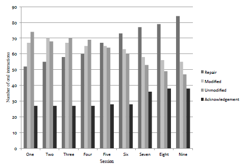 When the recast feedback strategy was applied to Group 2, the number of error repairs slightly increased during the nine sessions. The number of error repairs improved from 52 in session one to 84 in session nine. On the other hand, the number of errors that the students modified but did not repair as well as the ones that the students repeated or unmodified was higher than the number of repairs until session four. It is from session five that the number of repairs exceeds the number of no repairs. When evaluating recast feedback, acknowledgement, which is another type of uptake, was also registered. Acknowledgement was stable (27-28) from the first to the sixth session, and was increasing from the seventh session to the last one (36-38; Figure 2). This student uptake may have occurred due to the repeatability of the strategy.