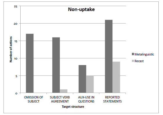 Twenty-one non-uptakes were registered during interactions using metalinguistic feedback in contrast to nine no-uptakes during interactions using recast feedback. Perhaps this occurred because the metalinguistic strategy elicited answers from students instead of providing them, so some students decided not to respond (Figure 3).