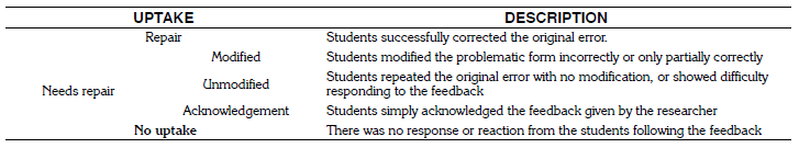 A record sheet was used to collect data in order to register the type of student response (uptake) to the corresponding feedback. Based on the on the existing categories of uptake sequences proposed by Lyster and Ranta, (1997), uptake was then coded as either “repair” or “needs repair.” For this study, the following verbal responses were considered “uptake” as presented in the following table 1: