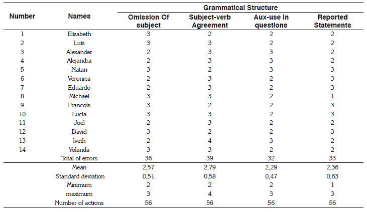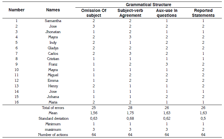 The standard deviation of non-repair errors of the four grammatical structures in session nine using metalinguistic feedback strategy (Table 2) was lower in comparison with the standard deviation of errors registered in the diagnostic test.