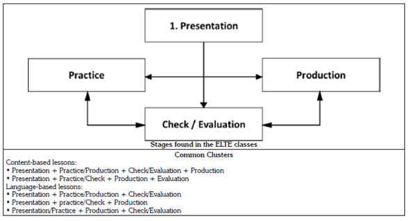 Figure 1 above indicates that the five stages may happen in different clusters in the observed ELTE content-based and language-based lessons but always with the presentation stage at first. The combination of these stages reveals that the ELTE classroom interaction analyzed in this study started with the TEs’ presentation of the contents, activities, and tasks to do during the lesson, followed by either student practice or production of the contents presented. This practice or production stage could be checked by the TE, usually with the aim of offering a new stage of practice or production. The evaluation stage generally occurred at the end of each session.