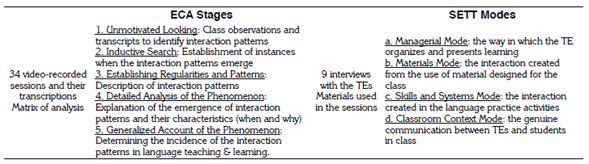 Two research approaches -ethnomethodological conversation analysis (ECA) and self-evaluation of teacher talk (SETT)- were implemented to identify the manner in which classroom interaction occurs in ELTE undergraduate programs, its characteristics, and pedagogical implications. In total, 34 classroom instruction sessions of nine TEs were video-recorded and transcribed. The sessions were both content-based and language-based classes at different levels of English proficiency of three ELTE undergraduate programs (usually between A2 and B2 level according to the Common European Framework of Reference; CEFR). Two occurred in private universities, and the other in a state university. These three programs have two common aspects in the curriculum: (a) a fundamental axis in which English language-based courses are organized sequentially per English language proficiency levels (from A1 to B2/C1), and (b), a pedagogical axis in which English language pedagogical content-based courses are organized per semester (from the fourth to the tenth). These courses cover pedagogical content regarding English language teaching, didactics, practicum, material design/development, Anglophone literature, applied linguistics, and intercultural/oral communication. The TEs all have a certified English language C1 proficiency level, and hold at least a master’s degree in either applied linguistics, education, or English language teaching. The TEs have between 6 to 16 years of experience in teaching related courses at university level.