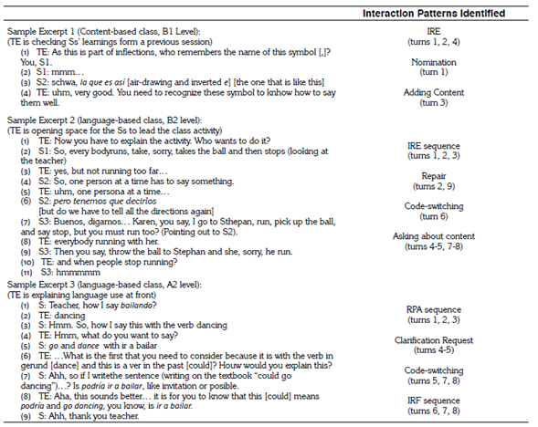 In each transactional episode, we found the same interaction patterns as those identified in the stages of EFL classes, that is, IRE/F sequence, clarification requests, nomination, RPA sequence, repair, recast, asking about content, and adding content (see Table 2). However, every so often these patterns had an extended purpose during interaction. While interaction patterns in EFL classes have only the purpose of teaching, correcting, and practicing English for general uses, patterns in the recorded ELTE classes also had the purpose of opening spaces for learning and practicing how to teach and correct this language.