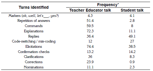 The three sample excerpts in Table 2 above demonstrate how the TEs maintained pedagogical efforts for the students to learn and practice how to teach and correct English by using repetitive interaction patterns. Those are the IRE/F sequence (Sinclair & Coulhart, 1975) or the RPA sequence (Lucero, 2011), adding or asking about content (Lucero, 2012), repair (Schegloff, 1997; 2000), and code-switching (Ûstûnel & Seedhouse, 2005). All of these patterns in combination demonstrate the manner in which TEs model classroom practices or request for English language contents. Table 3 indicates how classroom talk is mostly filled with the TEs’ use of commands, explanations, elicitations, and clarifications-the type of turns that mostly control classroom interaction. Along with these interaction patterns, we identified two others that were recurrent: repetition of students’ answers and approval bids.