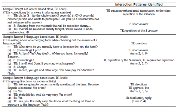As we observed both language-based as well as content-based classes in ELTE classes, it became clear that there was much more of a chance for interaction in the latter due to the fact that the conversation topics of the content-based classes allowed for advanced participation and longer turns of speaking. In addition, the established interaction patterns between the TEs and students in both types of classes reveal a pedagogical purpose of opening spaces for learning and practicing how to teach and correct English. This purpose is common in all the TEs’ conversational agenda. Although this agenda is also composed of interactional purposes that should be congruent with pedagogical ones, the TEs sometimes exercise contradictory interactional practices of their pedagogical purposes, usually demonstrating that they seem to have a very limited knowledge of how classroom interaction actually happens in their lessons.