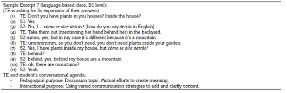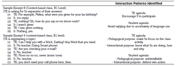 According to the TEs’ responses in the interviews and the students’ responses to an on-line survey1, they both come into the classroom with acquired routines of how classroom interaction should happen and a conversational agenda for each lesson. The acquired routines have been learned from previous interactional experiences lived in varied classrooms which include, for example, providing explanations when requested, responding to questions, requesting clarification or confirmation of explanations and directions, and participating in class discussions. These patterns are co-constructed to negotiate meaning (the topic to teach and learn) with a preferred organization of turns (the way to initiate, maintain, and end an exchange). Conversational agendas in turn are expected to have certain formats and contents (Tracy & Robles, 2013), the purposes of which are locally managed only by the participants’ orientations to prior and subsequent turns in interaction (Benwell & Stokoe, 2006; Rymes, 2009). Considering both insights, we determine that the TEs’ and the students’ conversational agendas observed in this study are composed of pedagogical and interactional purposes2, the former sustains what is to be spoken, taught or learned, while the latter indicates how to do so in interaction. Sample excerpt 7 in Table 5 gives an example of this issue.