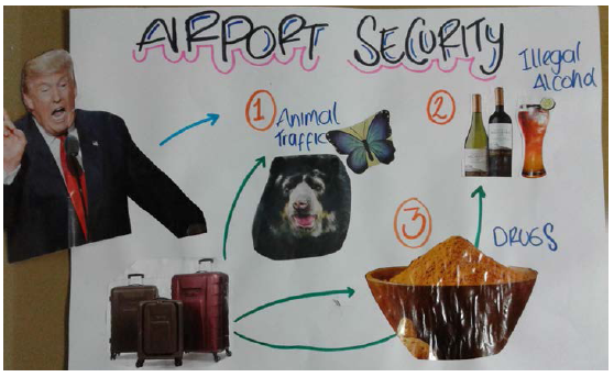Figure 1 demonstrates the previous statements as students were using their L2 to express their ideas in regard to the topic being addressed. Becoming aware of the role played by multimodal designs in effectively communicating meaning involves the identification and recognition of the fact that “all meaning-making is multimodal” (p. 81). Developing pedagogical practices that lead students to view the relevance of using multimodal texts to disclose meaning is essential for the reshaping of available sources. In this respect, Ho (2011) argues that “students’ sensitivities… include a critical awareness of how different modes shape and reshape what is represented, with attention to specific shifts across modes and how these mode differences interact with media variations to affect ways of learning” (p. 5). Learners create new meaning artifacts, which reflect their own construction process grounded in their viewpoints and critical interpretations. The artifact presented above exhibits a sample of students’ visual representations that became tools for fostering reflections and understandings about reality.