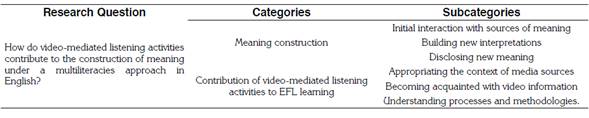Table 1 evidences the analytical model resultant from the analysis of the hermeneutic unit called “multiliteracies.” In this unit, two major categories are displayed as follows: (a) meaning construction, and (b) contribution of video-mediated listening activities to EFL learning. The former category is composed of three sub-categories: initial interaction with sources of meaning; building new interpretations; and disclosing new meaning. The latter category unveils three sub-categories as well: appropriating the context of the media sources; becoming acquainted with video information; and understanding processes and methodologies, as seen in the table below.