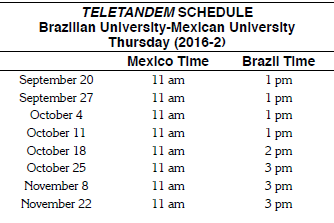 Because the partnership is inserted in an institutionally nonintegrated Teletandem modality in both contexts, Brazil and Mexico, it was necessary to consider the specificities related to a larger flexibility and participation of the interactants who had to, for instance, adapt to the changes of schedule during the semester. Therefore, the interface among mediators is extremely relevant because, many times, some adjustments and concessions are required. An example of this is illustrated in the following chart, which shows that the Brazilian group went through several changes of interaction schedule throughout the second semester of 2016 to adapt it to the needs of the Mexican students. This resulted from facts related to the availability of the laboratory and other activities at the Mediateca, and also from variation of daylight saving time schedules. While Mexican groups maintained the same schedule, Brazilian groups started the interactions at 1 pm, then at 2 pm, and finally 3 pm. This means that when Brazilian students commit themselves to the process, they are committing almost the whole afternoon during the semester.