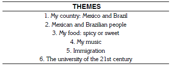 Mediators may also choose themes to be discussed during interactions. These themes aim to deepen students’ knowledge of issues related to linguistic, discursive, and intercultural aspects so that exchanges among interactants overtake the limits of a simple chat about daily matters. These topics generally emerge in the first interactions in which interactants build a bond. However, the selection of themes motivates students to search contents related to the proposed issues as well as to prepare activities to be used in the session. The following chart shows a list of the themes that were chosen for the interactions in the second semester of 2016 with the purpose of deepening intercultural issues.