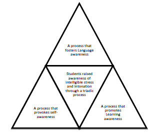 Through the interrelation of the three categories presented above and the literature that supports them, a core category appeared: students enhanced awareness of intelligible stress and intonation through a triadic process. The term triadic process was chosen because the enhancement of the students’ awareness did not occur immediately or quickly. On the contrary, learners took long time to take steps towards awareness of intelligibility and they are still in the process to figure out how to be more intelligible. Developing awareness requires time for strategy use, reflection, and implementation of the target areas in one’s speech. Additionally, the metaphor of the triad was used to illustrate the three areas in which awareness could have been developed, which were interrelated and equally important for the implementation of the current study. In fact, after implementing the strategies and activities proposed for this research study, it was evident that advanced English learners can raise awareness of their own intelligible stress and intonation by a triadic process that involves: (a) fostering language awareness to understand the use of suprasegmental features and acknowledge their communicative value, (b) promoting learning awareness to use metacognitive strategies to become self-regulated learners, and (c) provoking self-awareness thanks to the identification of the learner’s own actual register, which helped them enhance their self- confidence as English speakers.