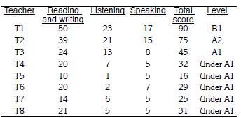 As shown in Table 1 above, the teachers were placed between A1 and B1 level based on the Common European Framework of Reference (CEFR), 62.5% scored lower than the A1 level; 12.5% reached an A1 level, 12.5% got an A2 level, while 12.5% got a B1. This indicates that most of the teachers selected for this study did not have the required linguistic competence for teaching the target language.