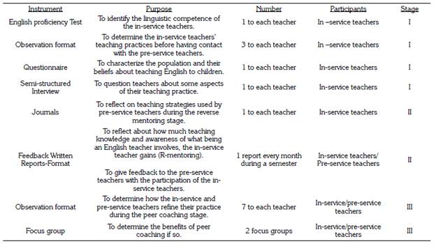 T3 Phase III. In this phase, the peer coaching strategy was implemented. Both in-service and pre- service teachers worked collaboratively in order to improve their teaching practices. Once a week the in- service teachers observed the pre-service teachers and vice-versa. Before the observations, they agreed on the aspects to be observed (pre-conference). During the observations, both the in-service and the pre- service teachers took field notes (observation). Each week after the observations, teachers met to provide each other with feedback (post-conference). During the implementation of this stage, a focus group was formed in order to determine how the process was carried out. The instruments used to collect data during phases I, II and III are seen in Table 2.