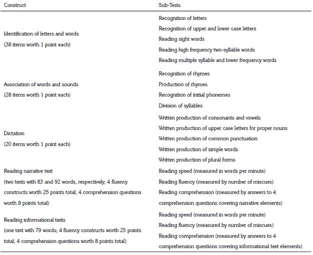 To operationalize literacy skill development for the EFL context in Mexico, the authors adapted a quantitative measure of early literacy and entitled it the Early Spanish Literacy Assessment (ESLA). The instrument includes five sub-tests, two of which (1 and 3) are based on an existing instrument, the Woodcock Language Proficiency Battery-Revised: Spanish Form (Woodcock & Muñoz-Sandoval, 1995) which has been extensively validated across a range of populations (see Páez & Rinaldi, 2006). The authors designed the remaining sub-sections (2, 4, and 5) to align with the Mexican curriculum and approach to literacy acquisition. Consistent with the curriculum at ages 6-7, the authors included four sub-tests to evaluate various aspects of reading, and one (Section 3) to evaluate writing (see Table 2). The instrument was piloted and revised several times to remove ambiguities (e.g., cultural relevance of pictures used) and to promote consistency of test administration and scoring among raters.