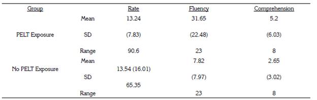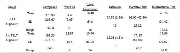 When the mean scores of the PELT exposure and No PELT exposure groups were compared, the participants exposed to PELT scored significantly higher on all sub-tests of the ESLA, as well as had significantly higher total composite scores on the ESLA. Still, a wide range of scores existed both among and between participant groups on each of those sub-tests and the composite. The discussion that follows is framed according to each sub-test, and then the composite scores of the ESLA.