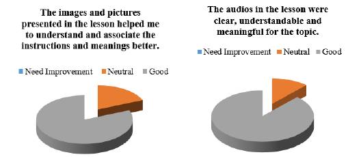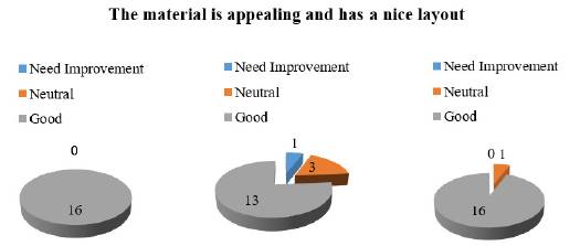The second aspect in this sub-category deals with attractive presentation in the lessons. As asserted by Lamb (2011) “visual appeal is key not only in its ability to grab the interest of your reader but also to help the reader remember the details of your message” (p. 14). We found evidence of undergraduates’ perception regarding the presentation in the surveys on students’ perceptions conducted after each lesson (see Figure 5). This data provided valuable insights about the layout of the materials since the majority of the undergraduates considered the layout as appealing.