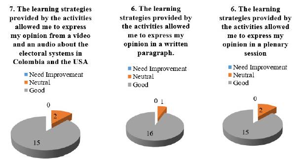 The variety of activities had a positive impact on undergraduates as they felt engaged into the lessons. Moreover, this concern made the lessons more enjoyable and interesting. The survey on students’ perceptions evidences that this situation was beneficial for undergraduates while they were developing the lessons (see Figure 4).