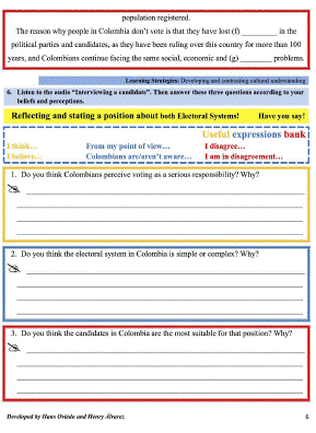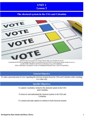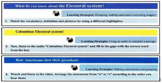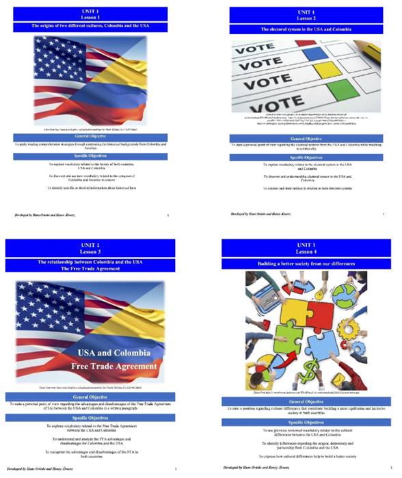 The selection of the topics, content, and type of activities took into account our undergraduates’ preferences. To do so, we used a Likert scale survey (see Appendix B) to gather information related to the most appropriate content, learning activities and strategies for the customized lessons. The analysis of this data provided sound information to start designing the lessons. After this review, the topics for the lessons were: the origins of two different cultures, Colombia and the USA (lesson 1), the electoral system in the USA and Colombia (lesson 2), the relationship between Colombia and the USA—the Free Trade Agreement (lesson 3) and finally, building a better society from our differences (lesson 4).