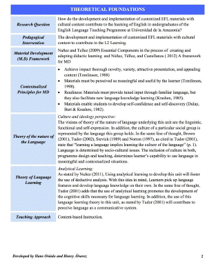 The process of developing materials implies a reflexive and analytical process of reviewing our knowledge and pedagogical practices. Núñez et al. (2004), Núñez and Téllez (2009) and Núñez et al. (2012) affirm that MD is not a task that should be entrusted only to publishing houses, but also to EFL teachers. Likewise, Kessler and Plakans (2001) asserted that the teaching field needs more teachers willing to develop customized materials, because they are the ones who know students’ specific traits and needs. For this reason, the most appropriate people to attend such needs and traits and bring the materials they create to their classes are teachers, since they are the experts in guiding and appraising students’ learning.