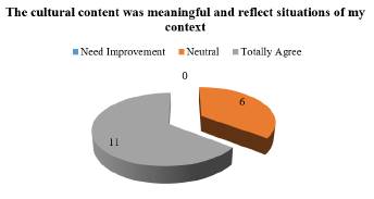 To achieve more meaningful communication, both language and cultural content are fundamental. As affirmed by Kramsch (1998), language is linked to culture when it is used for communicative purposes. With this idea in mind, there are two important factors to consider in this study in terms of cultural content. First, undergraduates wanted to know more about the culture of English-speaking countries, in this case the USA. Second, they wanted to express their own cultural reality using the foreign language.