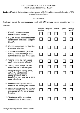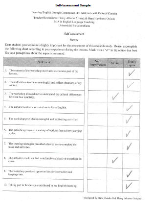 The data collection instruments used were students’ artefacts including the corresponding self-assessment, teachers’ field notes, and surveys administered at the end of each lesson. In relation to artefacts, Arhar, Kelly, and Kasten (2001) state that “artifacts and documents provide descriptive records that can enable the researcher to derive insights different from those provided by observations and interviews” (p. 163). This data collection instrument provided valuable information related to what undergraduates did during the lessons, in terms of learning English while dealing with the different language skills. Regarding fieldnotes, Burns (1999) affirms that they “are descriptions and accounts of events in the research context which are written in a relatively factual and objective style. They generally include reports of non-verbal information, physical settings, group structures and records of conversations and interactions between participants” (p. 87). We collected fieldnotes taking into consideration the aspects concerning this study, which are the contributions of customized lessons with cultural content in the learning of EFL. In reference to surveys, Bell (1993) states that “the aim of a survey is to obtain information which can be analyzed and patterns extracted and comparisons made” (p. 10). The surveys on students’ perception were conducted with all of the undergraduates to record their perceptions towards the customized lessons, their learning preferences, the cultural content, and learning activities.