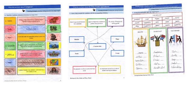 Provide a variety of activities, attractive presentation, and appealing content. We provided a wide range of activities in each lesson to attract undergraduates’ attention and interests. To this respect, Rico (2005) claims that “materials will involve different kinds of texts and different media, which the learners can use to develop their competence through a variety of different activities and tasks” (p. 106). For instance, Figure 3 exemplifies this particular situation as it presents a variety of matching activities as a way to introduce vocabulary.