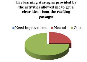 Catering learning styles and incorporating learning strategies acknowledges the fact that each person learns differently. Keeping this in mind, the inclusion of the aforementioned concerns in the customized materials contribute to EFL learning in several ways. First, considering how students’ specific learning traits intervene in the learning processes ensures that all students’ learning preferences are addressed. Second, the application of learning strategies contributed to EFL learning as it enables undergraduates to become independent leaners by reflecting and applying the different strategies to achieve their learning goals.