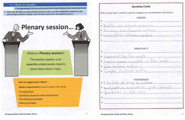 Offer communicative opportunities. This sub-category deals with the opportunities undergraduates had to use the language for communicative purposes during the implementation of the customized lessons. According to Gilmore (2007), the objective of materials “is to produce learners who are able to communicate effectively in the target language” (p. 6). Concerning this fact, during a plenary session undergraduates had the opportunity to recall concepts from previous lessons to express their own ideas and opinion (see Figure 8).